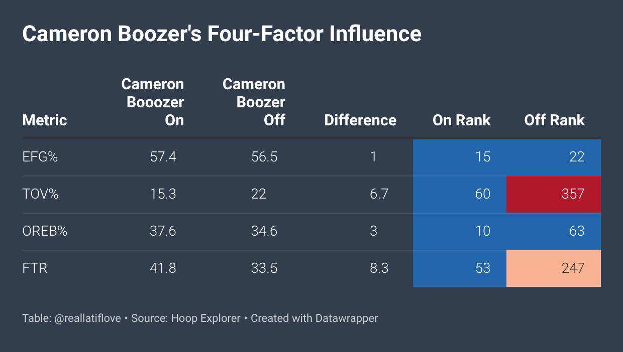 On his tough shooting nights, he still adds value because of his impact on the four factors, which Dean Oliver, a pioneer of modern basketball analytics, deemed the four most important stats for winning a basketball game. Boozer’s ability to not only score efficiently for himself but also create for others while taking care of the ball and extending possessions through offensive rebounding leads to immense offensive influence.