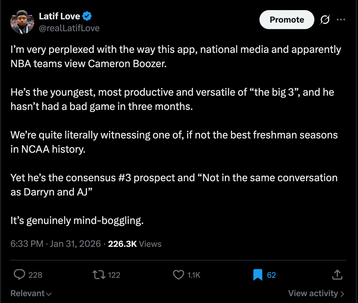 Dozens of people filled the replies with different iterations of player comparisons (mainly derogatory), comments about Boozer’s lower ceiling in comparison to Peterson or Dybantsa, or insinuated that his collegiate production wouldn’t translate to the NBA.