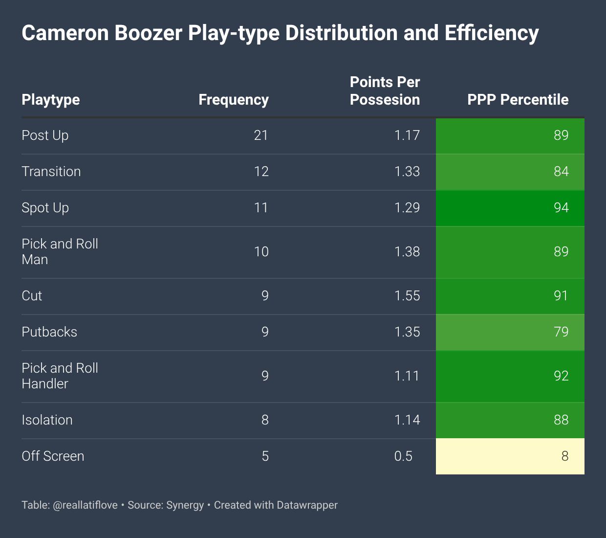 Below is a chart that illustrates Boozer’s most-used play types as a scorer. The chart shows how versatile Boozer is as an offensive player and how he maintains efficiency across different play types.