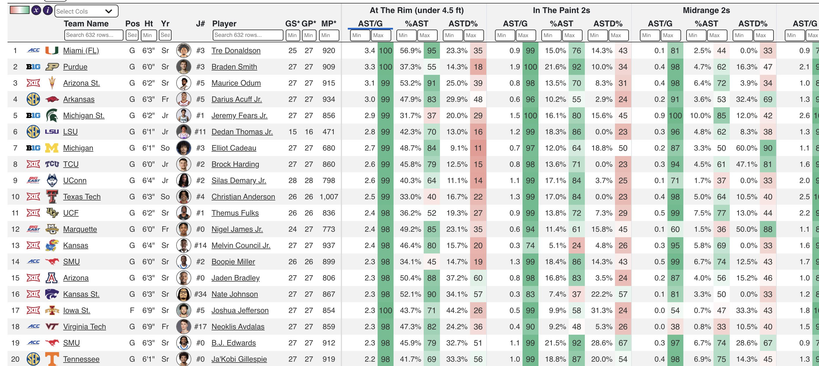 According to CBB Analytics, Acuff ranks fourth in the country in rim assists per game, which is widely viewed as the most risky yet most efficient type of assist.