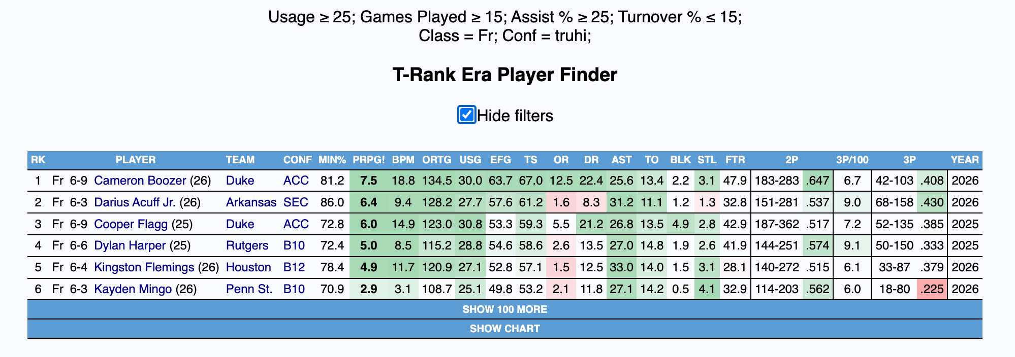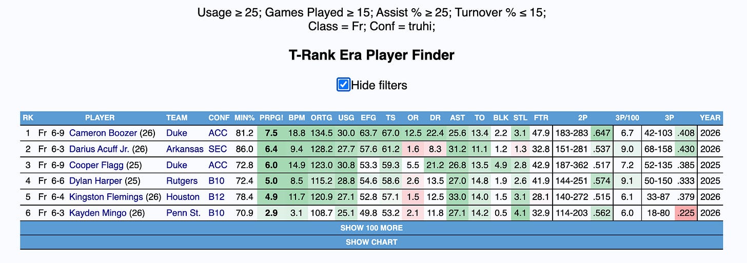 Acuff’s intersection of three-level scoring, efficiency, playmaking, and turnover aversion builds the framework of an excellent offensive prospect. Below is a query for high-usage creators who pass the ball at a high level and mitigate turnovers, highlighted by the top two picks in last year’s NBA Draft, Cameron Boozer, my top-ranked player in the class, and Kingston Flemings, another player I view as a top ten pick.
