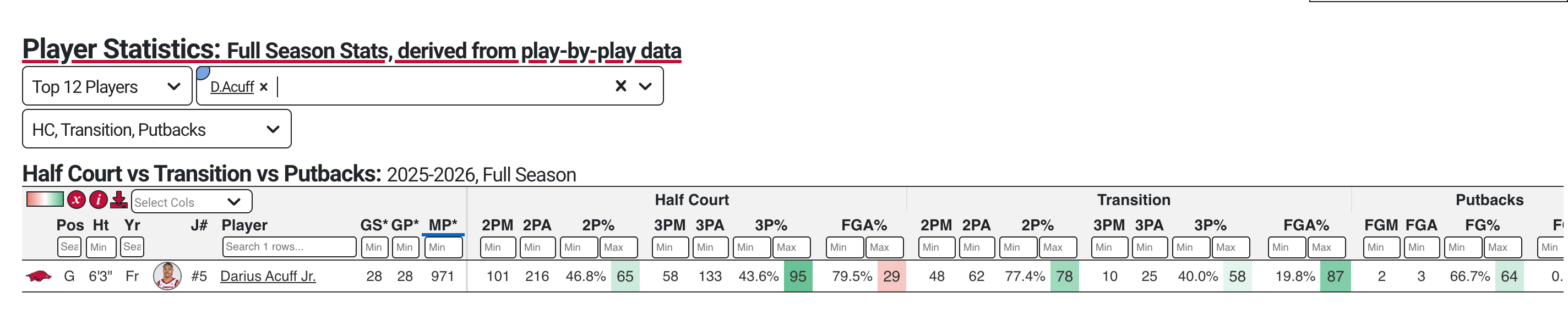 One of Acuff’s biggest strengths — his ability to score in transition — doubles as a point of critique for him. Because he’s in transition so much, just 79.5% (29th percentile) of his FG attempts come in the halfcourt, and his 2P% when he’s not in transition falls to just 46.8 percent.
