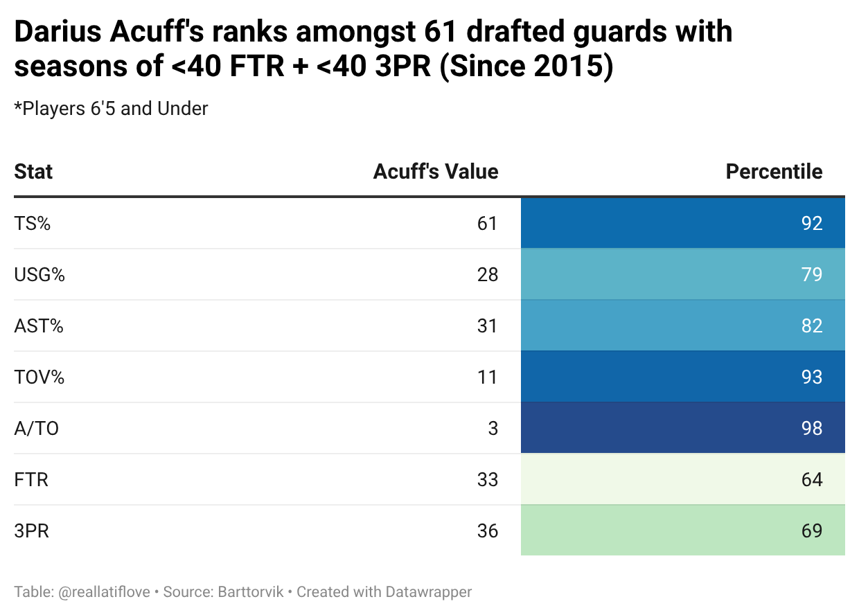 As an average-sized guard who is a below-the-rim finisher if his goal is to be a lead guard and/or offensive engine, it is very important that he either take threes at a higher volume or draw fouls at a higher volume to maximize his effiency Acuff currently sits at a 36.0 three-point attempt rate and a 32.8 free throw rate, which is a dangerous intersection for guard prospects to sit and has historically trended towards lackluster effiency in the NBA.