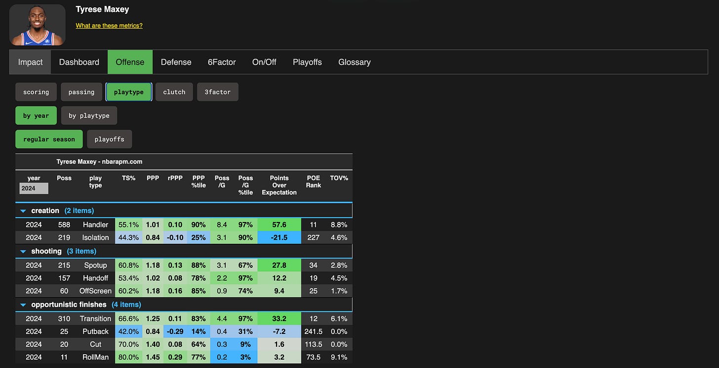 Two of the more successful smaller guards in the NBA — Tyrese Maxey and Jalen Brunson, who both fall under the >40 FTR +3PR Query (Brunson for his career at Villanova)— didn’t begin their careers with high usage. They played alongside all-world offensive engines, showed scalability, and eventually took the reins when the ecosystem made sense (Brunson in New York, Maxey post-2024).