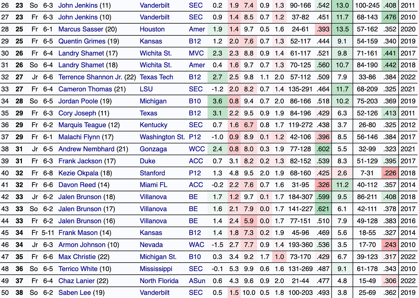 Acuff’s age-adjusted production in the SEC is elite. His ability to handle usage while avoiding turnoverers and to get his teammates involved is valuable.