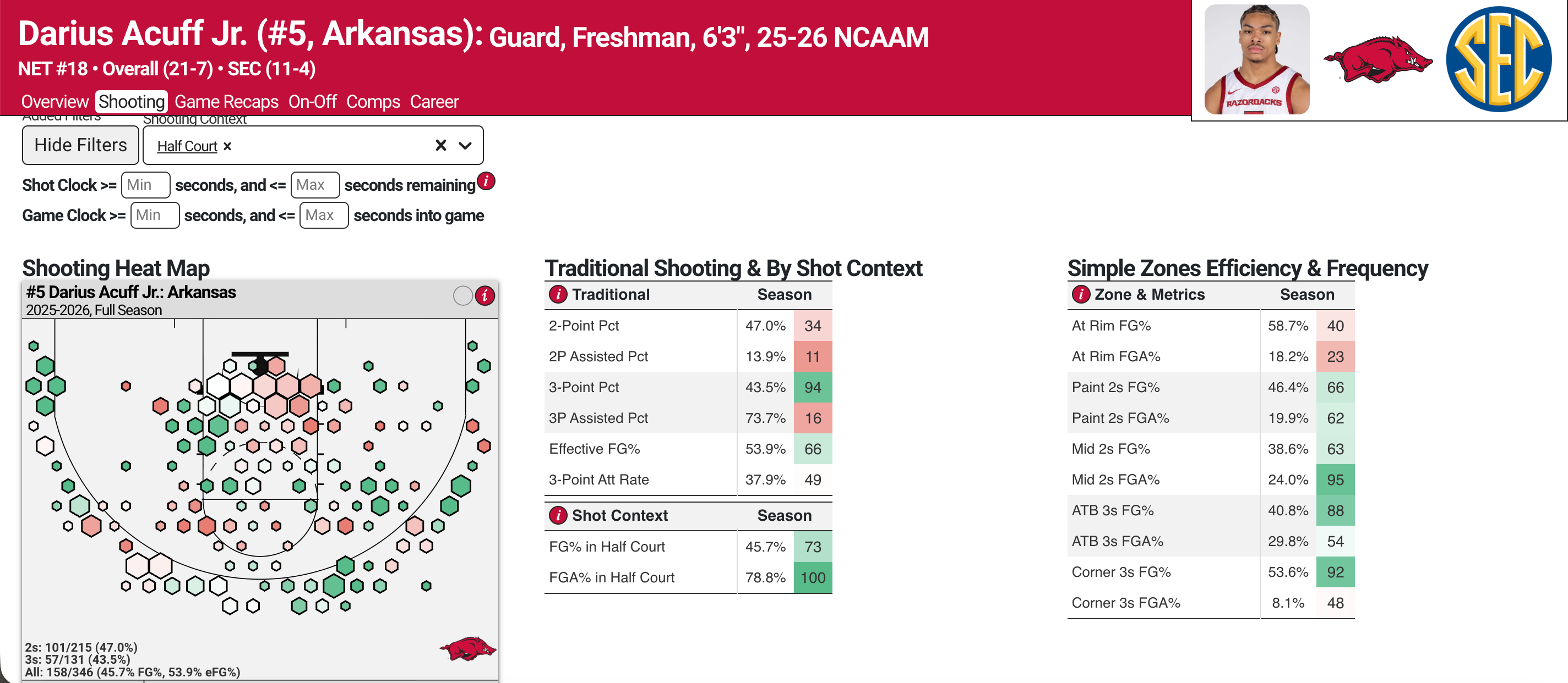 Acuff can also refine his shot diet/scoring process a bit to maximize effiency in the halfcourt. As the graphic from CBB analytics shows, just 18.2 percent of his half-court shots are at the rim, which ranks in the 23rd percentile. He often opts for, or is forced into, non-rim 2’s, which he is pretty efficient at, but the volume in which he shoots them instead of a rim attempt drags down his 2-point percent to 47.0 percent in the halfcourt (34th percentile).