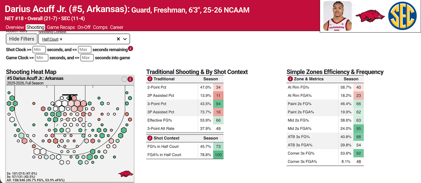 However, he has room to grow in the halfcourt in terms of technique as a driver and overall process as a scorer. Acuff is shooting 58.7 percent at the rim in the halfcourt on the season, which is more than fine for a freshman point guard, but he is generating just 0.838 points per possession and shooting 41.6% from two on drives.