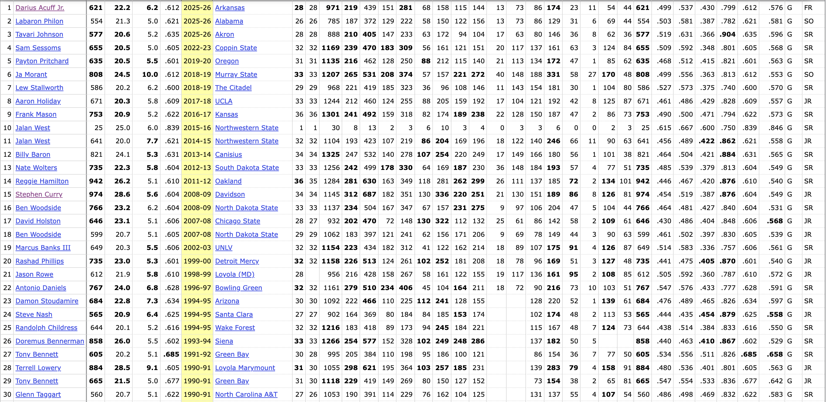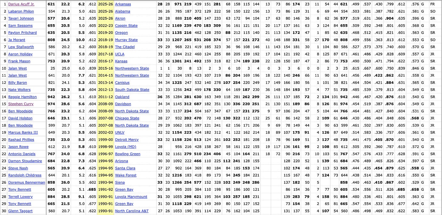 Acuff is averaging 22 points and six assists on a 61.2 true-shooting percentage, leading a top-three offense in the country in a top-three conference. His blanket production and effiency is rare to see in a freshman point guard, in fact, it’s only happened 39 times for any guard in NCAA history. Arkansas’s freshman sensation finds himself on a list with legends such as Steph Curry, Steve Nash, and even his uncle and agent, Rashad Phillips!