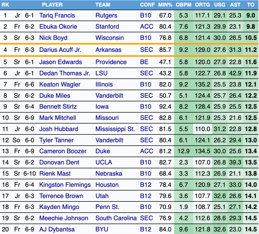 For context, it's worth noting that turnovers are down across the country. However, Acuff’s turnover aversion, given his usage, is still outlier-good relative to other guards this season. Because of that, Arkansas has been the best team in the country at avoiding turnovers.
