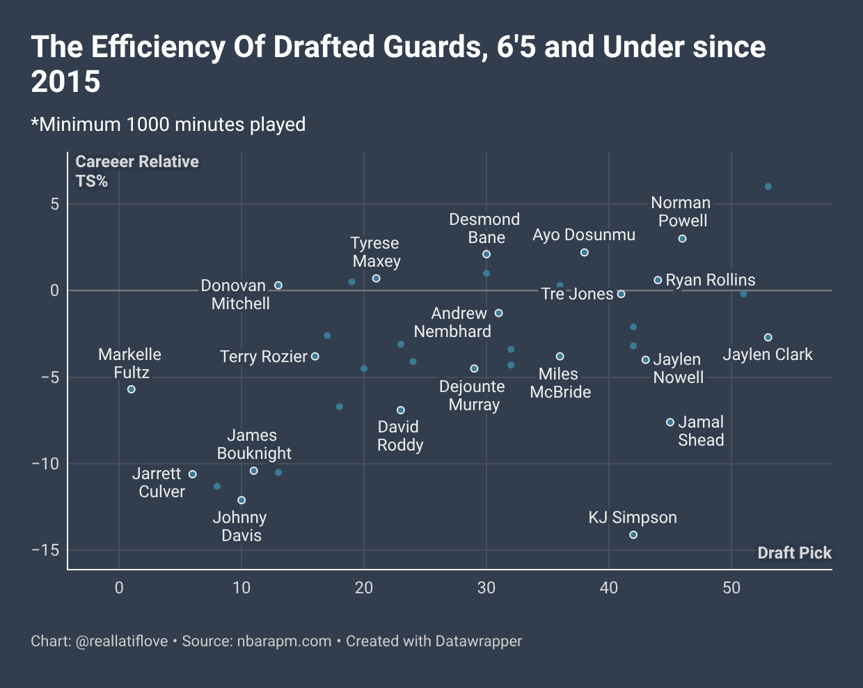 Since 2015, there have been 61 drafted guards 6’5 and below to have an FTR and 3PR of 40 and below in a singular season. 24 of the players have failed to reach 1000 minutes in the NBA; the others are pictured in the chart below. The query and subsequent graphic aren’t meant to say he’ll be a bad player, or fizzle out in the league like some of these guys; it just explains why not drawing fouls or shooting 3’s at volume can limit a scorer’s ceiling.