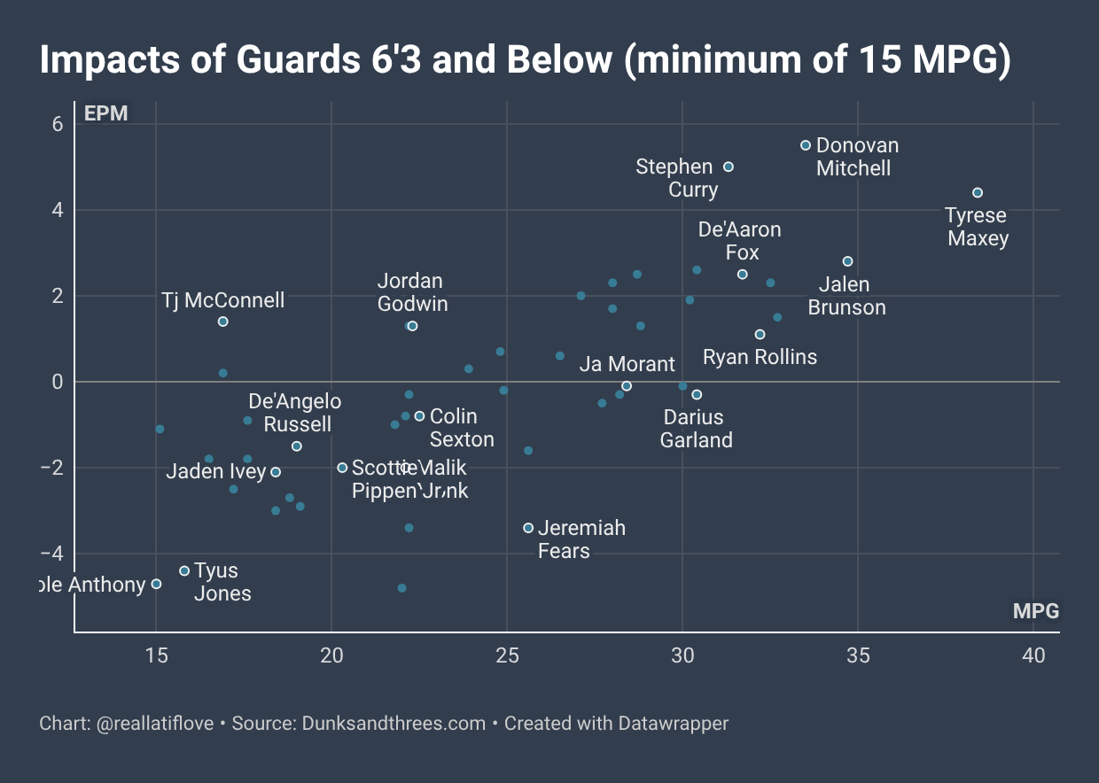 You’ll also notice that the vast majority of guards (with significant playing time) under 6’3 fall below a neutral estimated plus-minus (EPM).