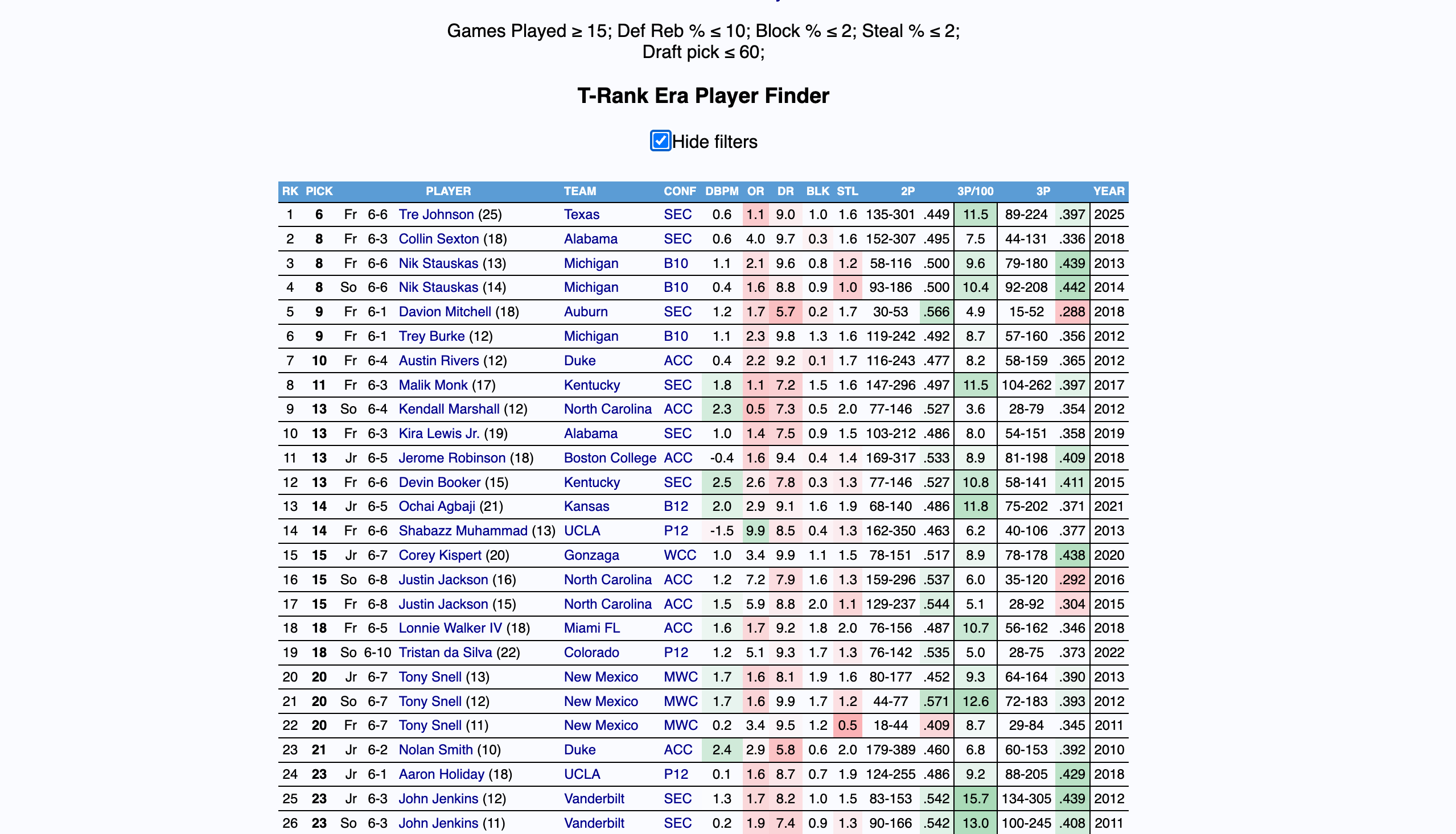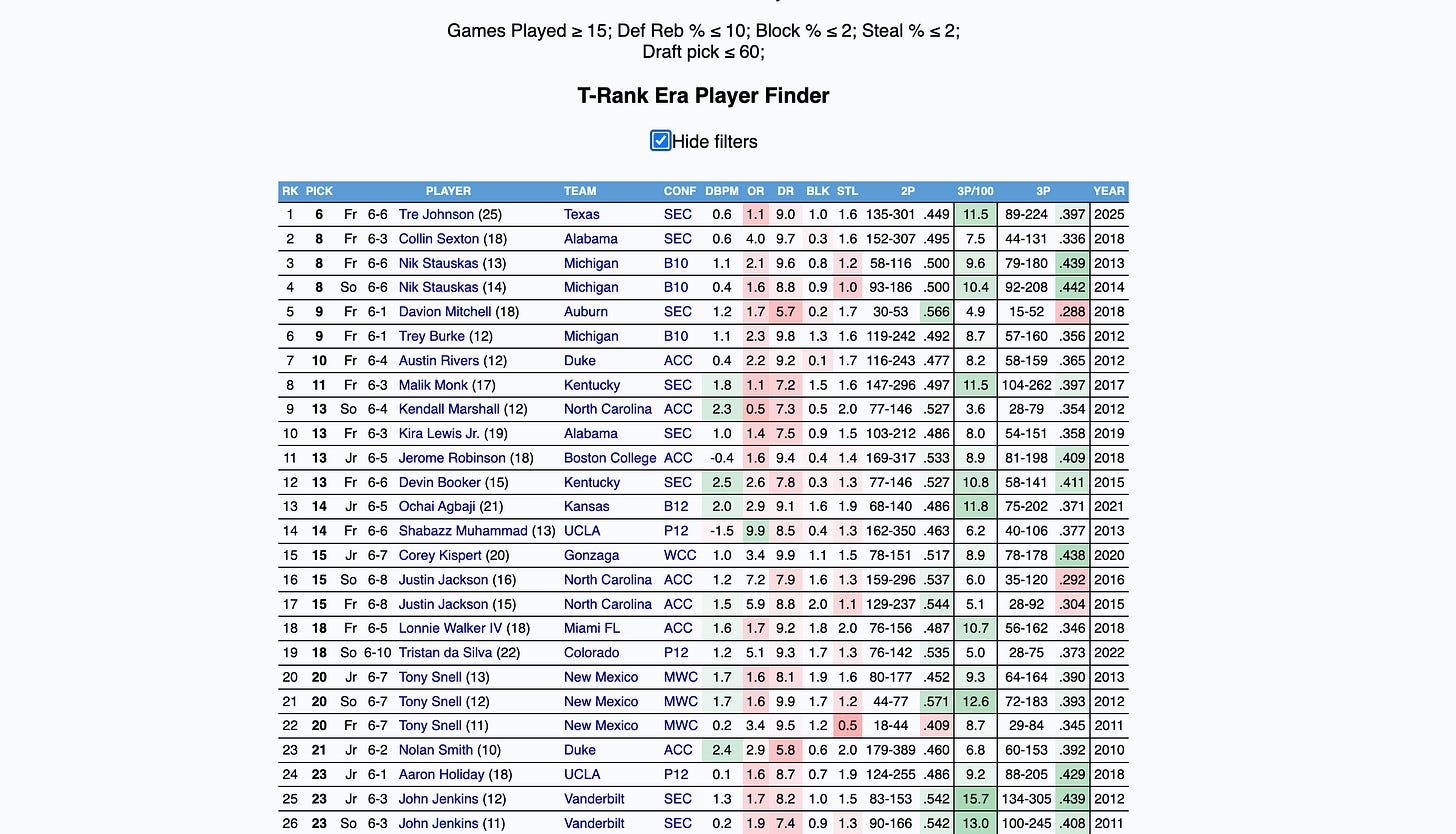 The biggest hole in Acuff’s profile is undoubtedly his defense. He doesn’t generate steals, doesn’t block shots, or rebound the ball particularly well. I know some have grown tired of seeing the word “stocks” float across your Twitter timeline, but it is undeniable that the vast majority of players who generate steals and blocks in college have turned out to be capable defenders in the NBA.