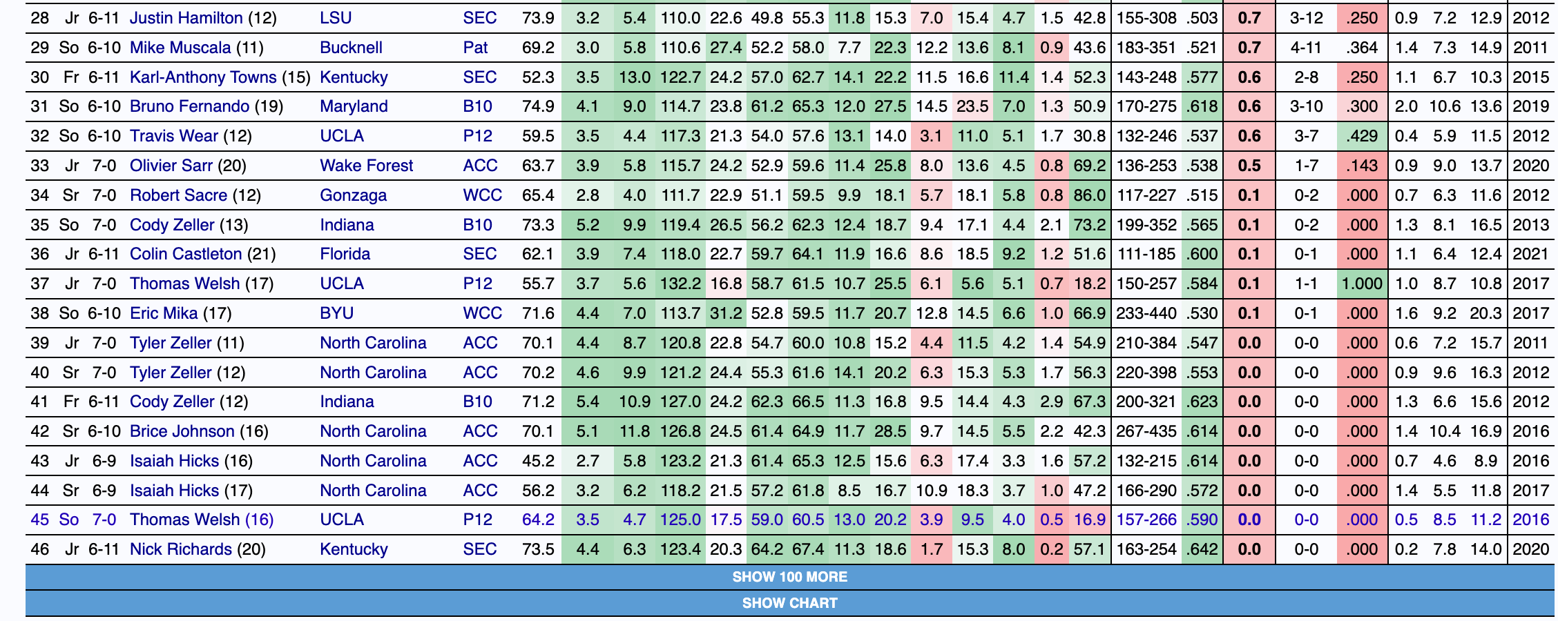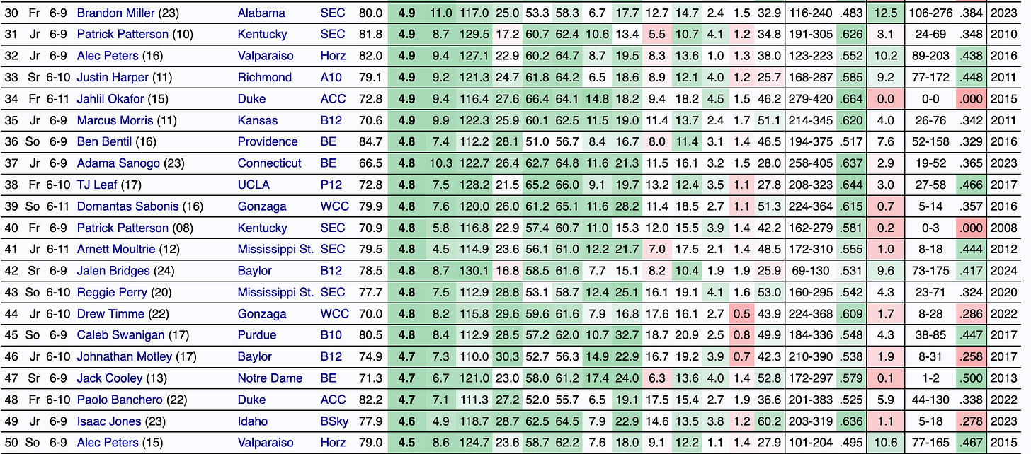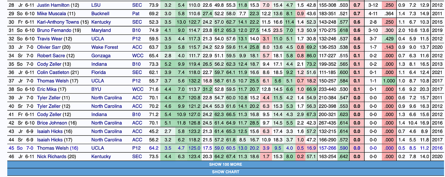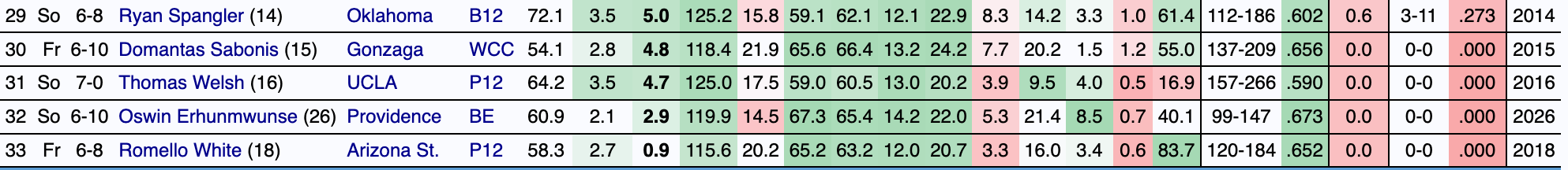 The forward’s rebounding, rim finishing, and overall effiency at this age in a high-major conference have not only made him extremely impactful for Washington’s offense but also put him in company with a ton of successful NBA players. The query below features outcomes from future Hall of Famers to quality backup big men. The goal of the query is not to directly compare those players to Steinbach, but to identify a trend in his skill set that leads to league-level productivity.