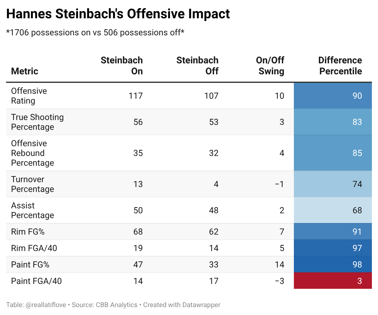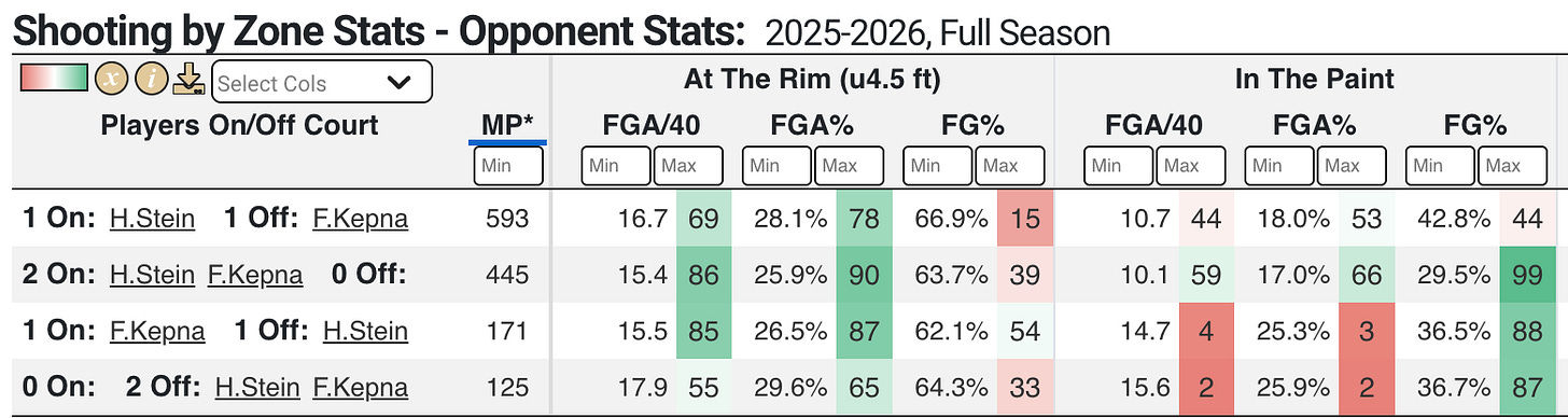 As the graphic below shows, teams attacked the rim more when Steinbach was at the five and scored at an extremely high rate compared to when he was off the floor entirely or playing the four next to Kepnang.