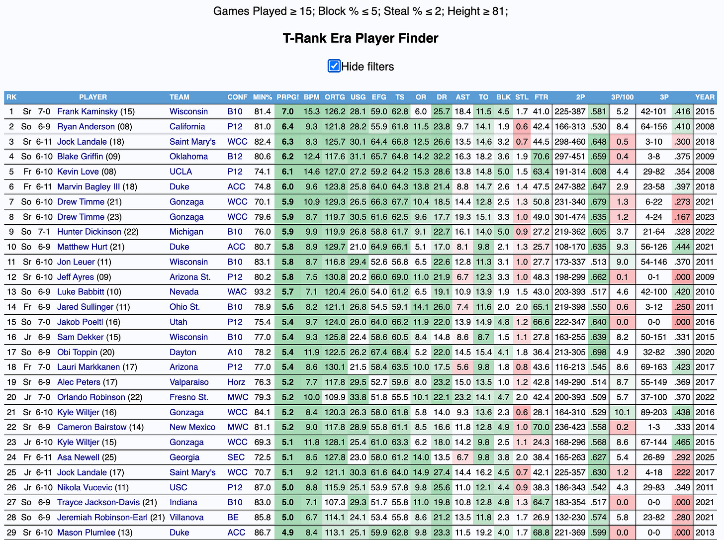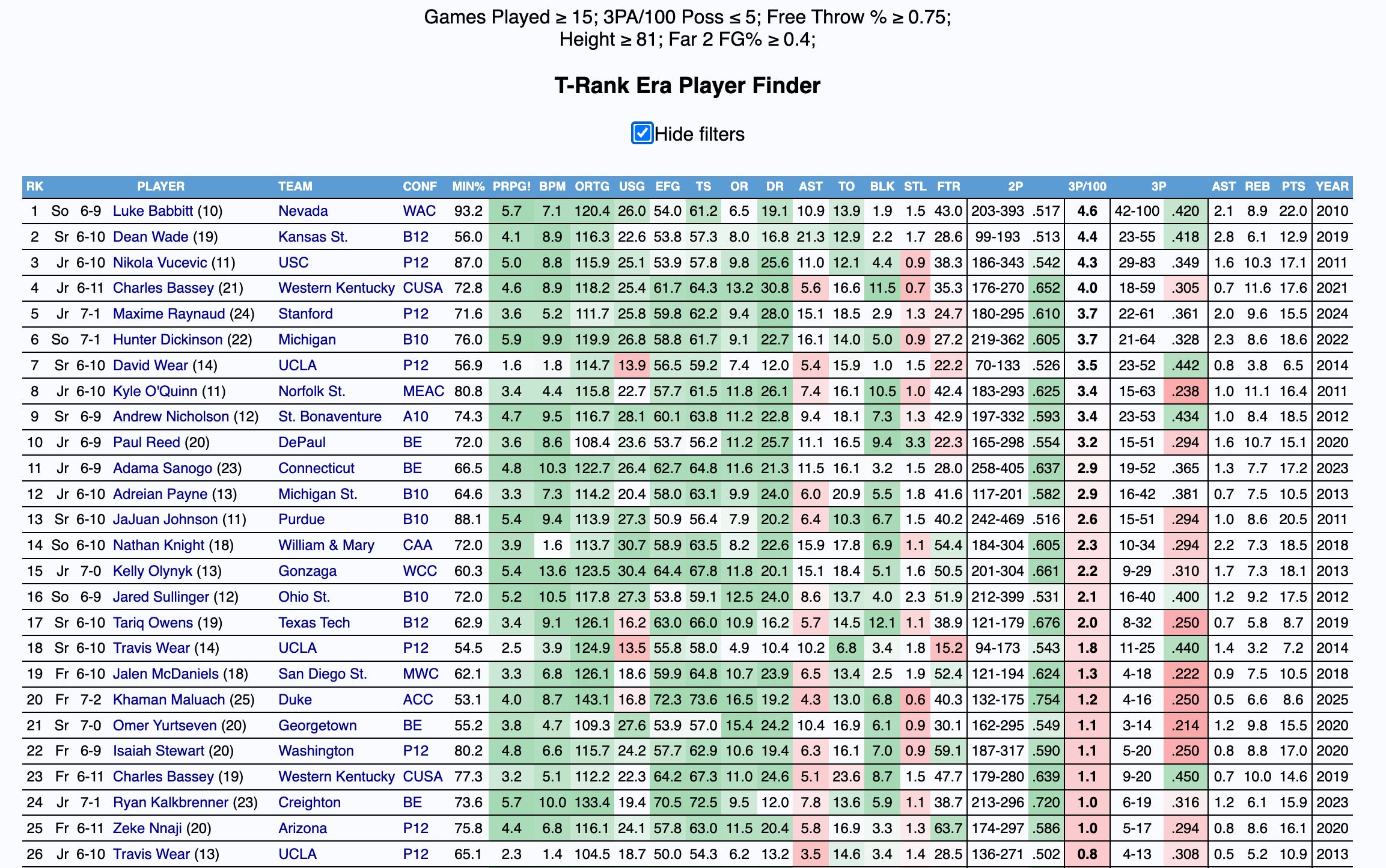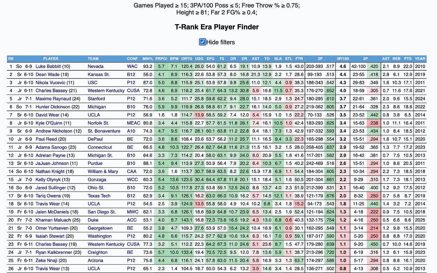 Fortunately for Steinbach, he does have the potential to shoot the ball. This season, he shot 34 percent from behind the arc on three attempts per 100 possessions, 44.8 percent on far twos, and 75.9 percent from the charity stripe. Below is a query for players 6’9 and above who attempted fewer than 5 3PA per 100 possessions, made 40 percent of their far twos, and shot 75 percent from the free throw line.