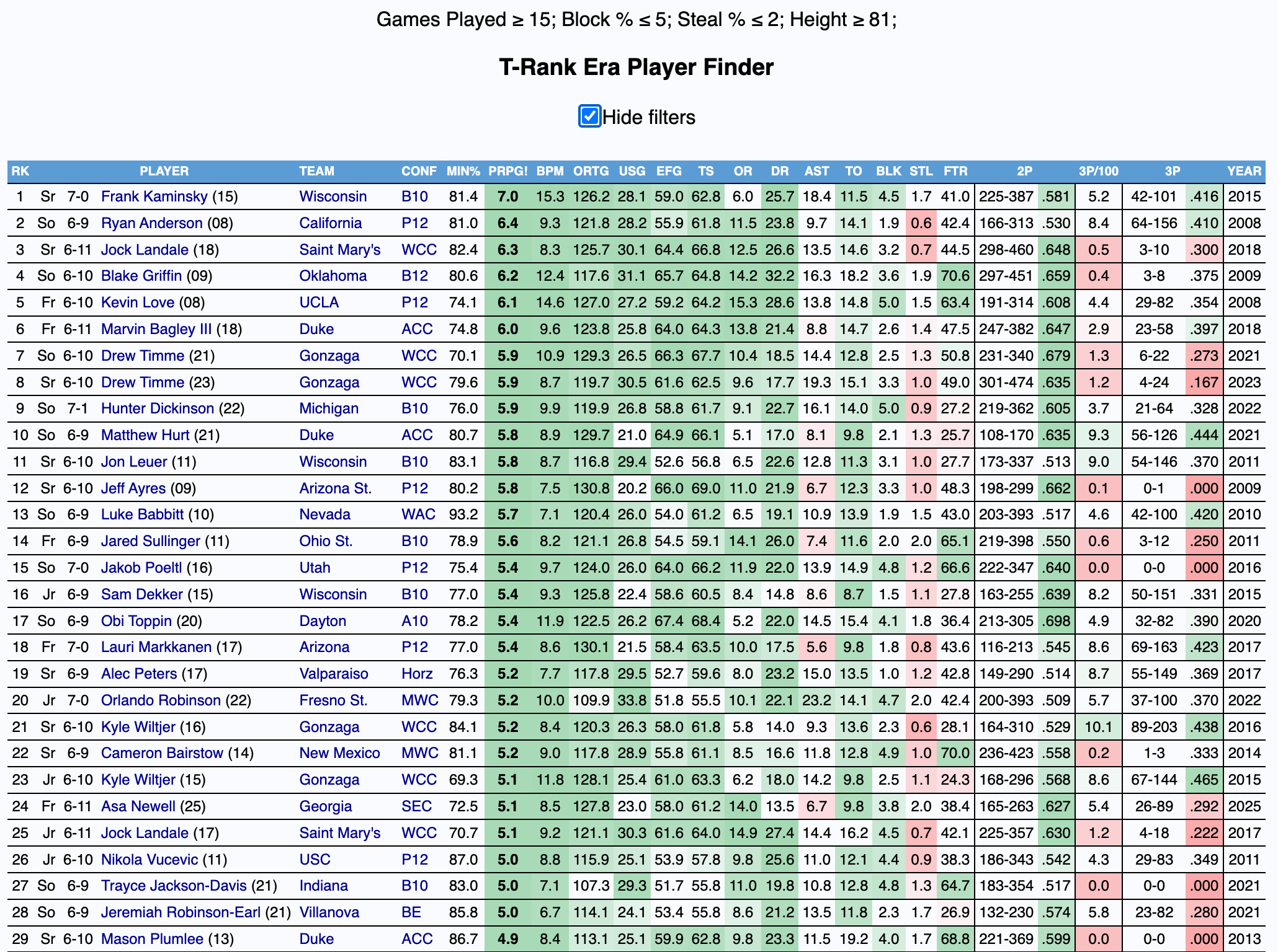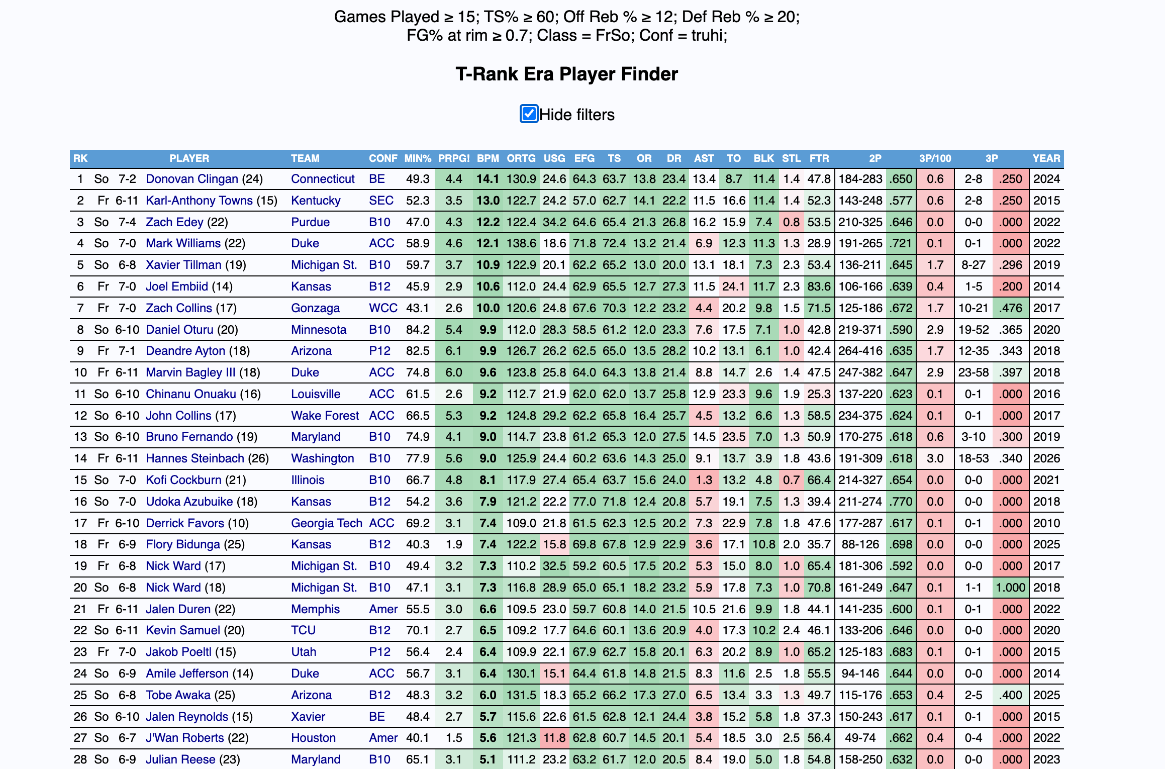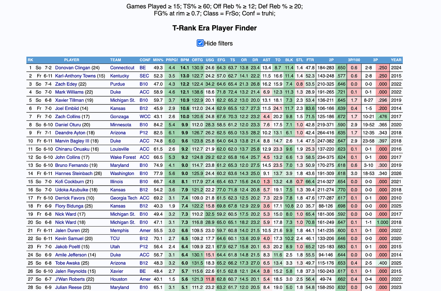 Fortunately for Steinbach, he does have the potential to shoot the ball. This season, he shot 34 percent from behind the arc on three attempts per 100 possessions, 44.8 percent on far twos, and 75.9 percent from the charity stripe. Below is a query for players 6’9 and above who attempted fewer than 5 3PA per 100 possessions, made 40 percent of their far twos, and shot 75 percent from the free throw line.