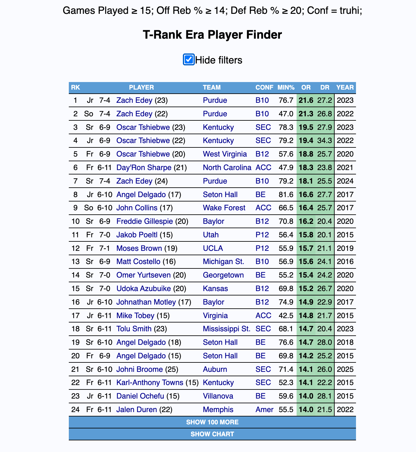 Since 2015, 24 NBA players (in their underclassmen seasons) have played at a high-major school and have an offensive rebound percentage of at least 14 and a defensive rebound percentage of at least 20. When Steinbach is inevitably drafted, his freshman season will rank 20th in offensive rebounding and 13th in defensive rebounding. This feat is even more remarkable when you consider that the freshman has spent a large percentage of his minutes with another big man on the floor.