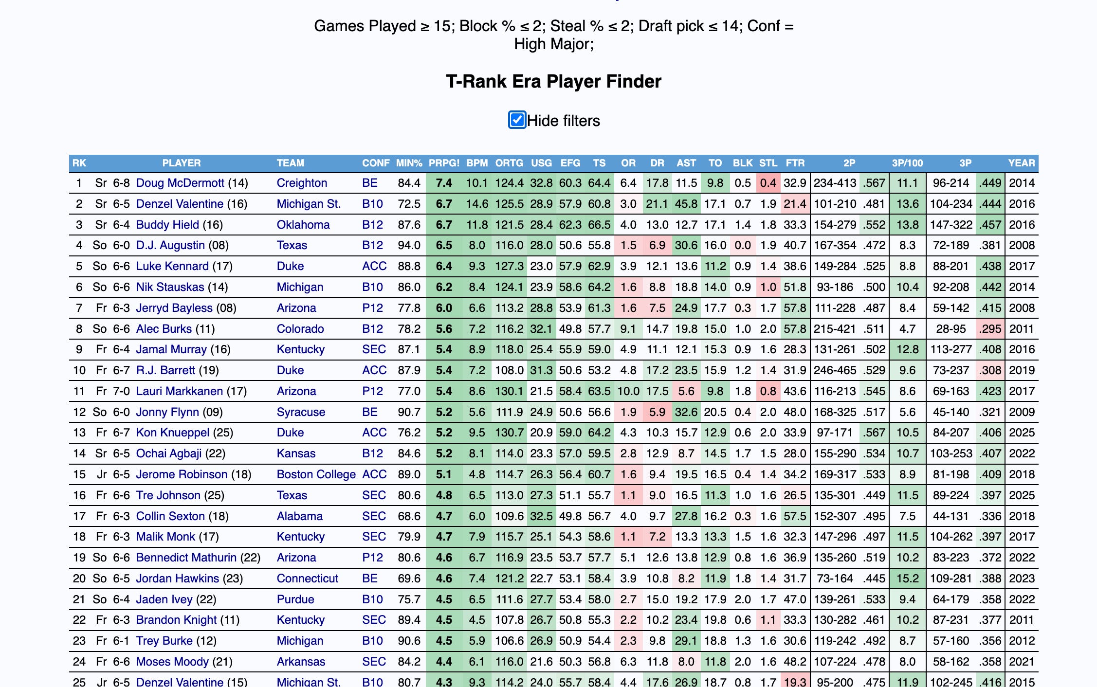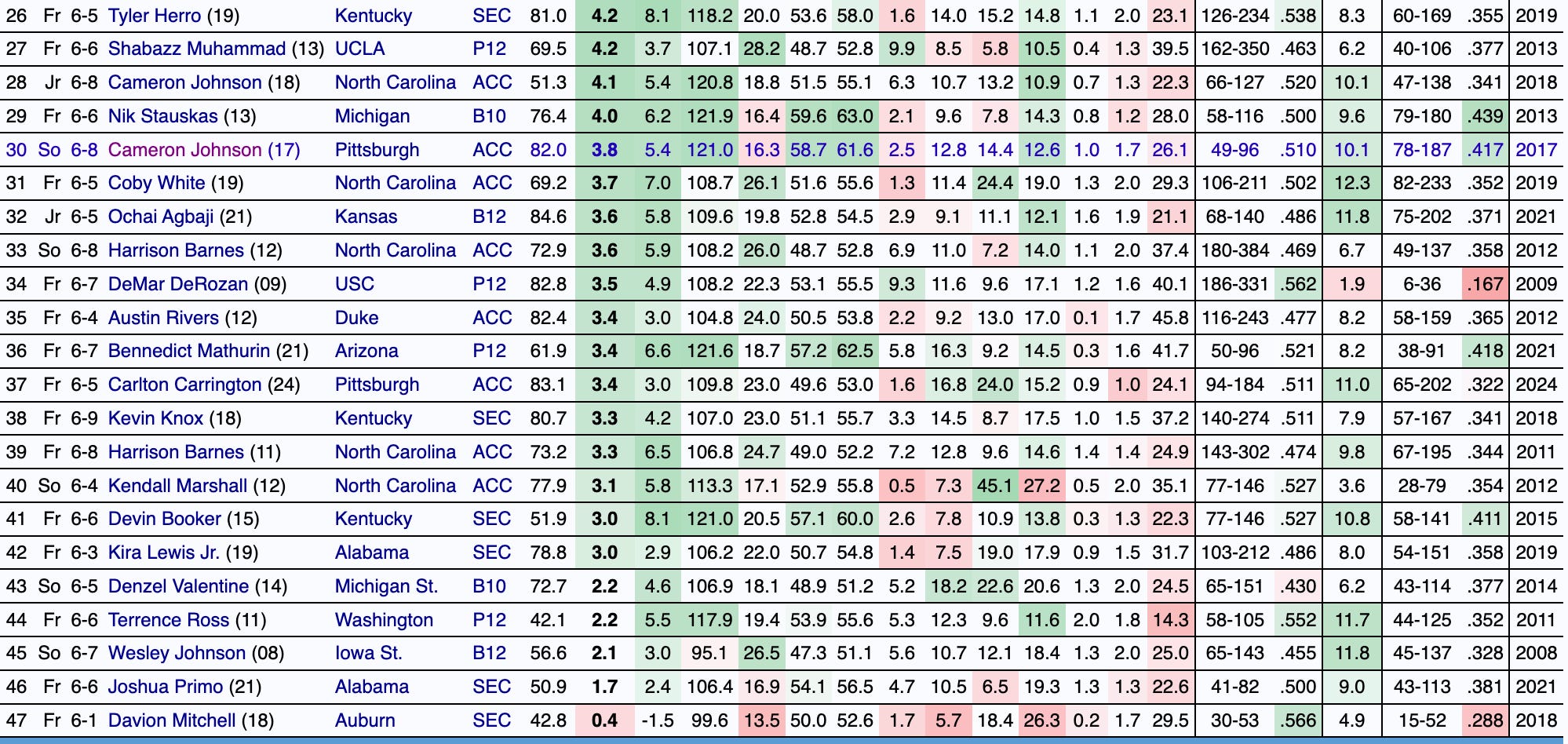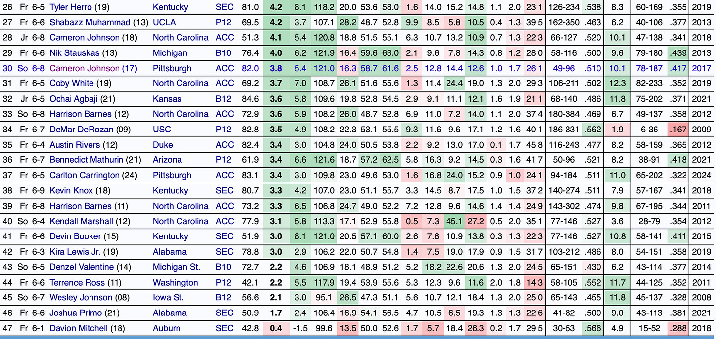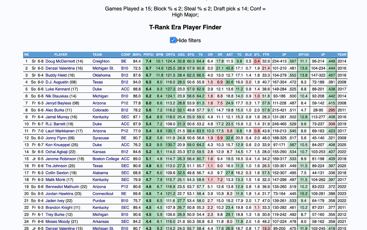 At 6-foot-6, with what looks to be a plus wingspan, Wagler has the length to bother shots and guard both guard spots, but he can be a streaky defender. Right now, he sits at below two steal percentage and two block percentage, which isn’t the end-all be-all, nor does it rule out any future growth, but there aren’t many examples of a freshman with these defensive playmaking numbers grading out as good NBA defenders. Below is a query for lottery picks who meet this criteria.