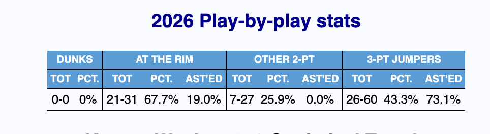 That said, there’s still meaningful room for growth. A larger sample will help validate the shooting numbers, especially off the dribble. Improving his efficiency inside the arc—either by getting all the way to the rim more often or improving his efficiency on short mid-range counters—would go a long way toward solidifying his offensive projection. Defensively, consistency will be the key factor.