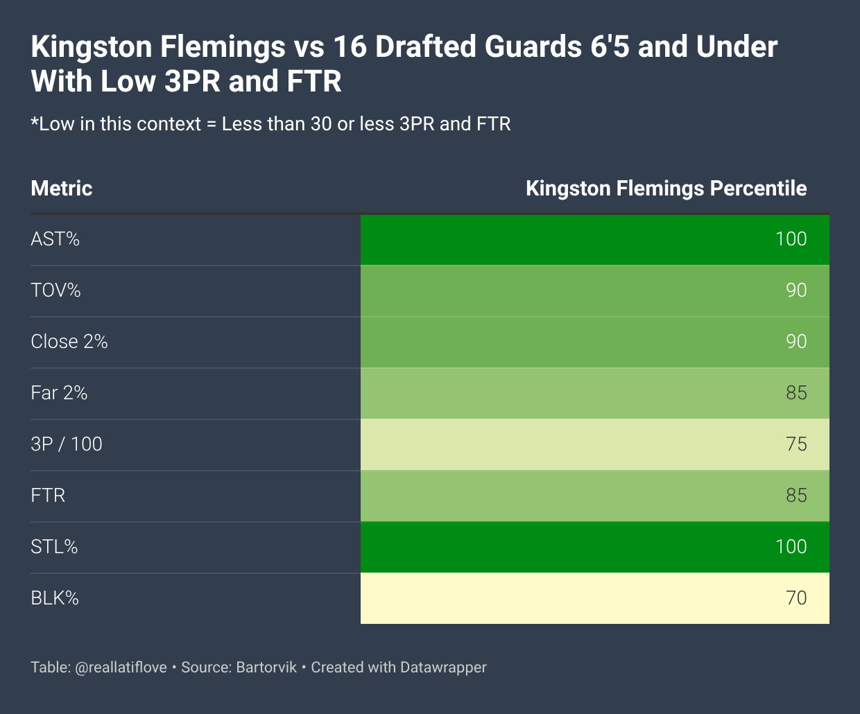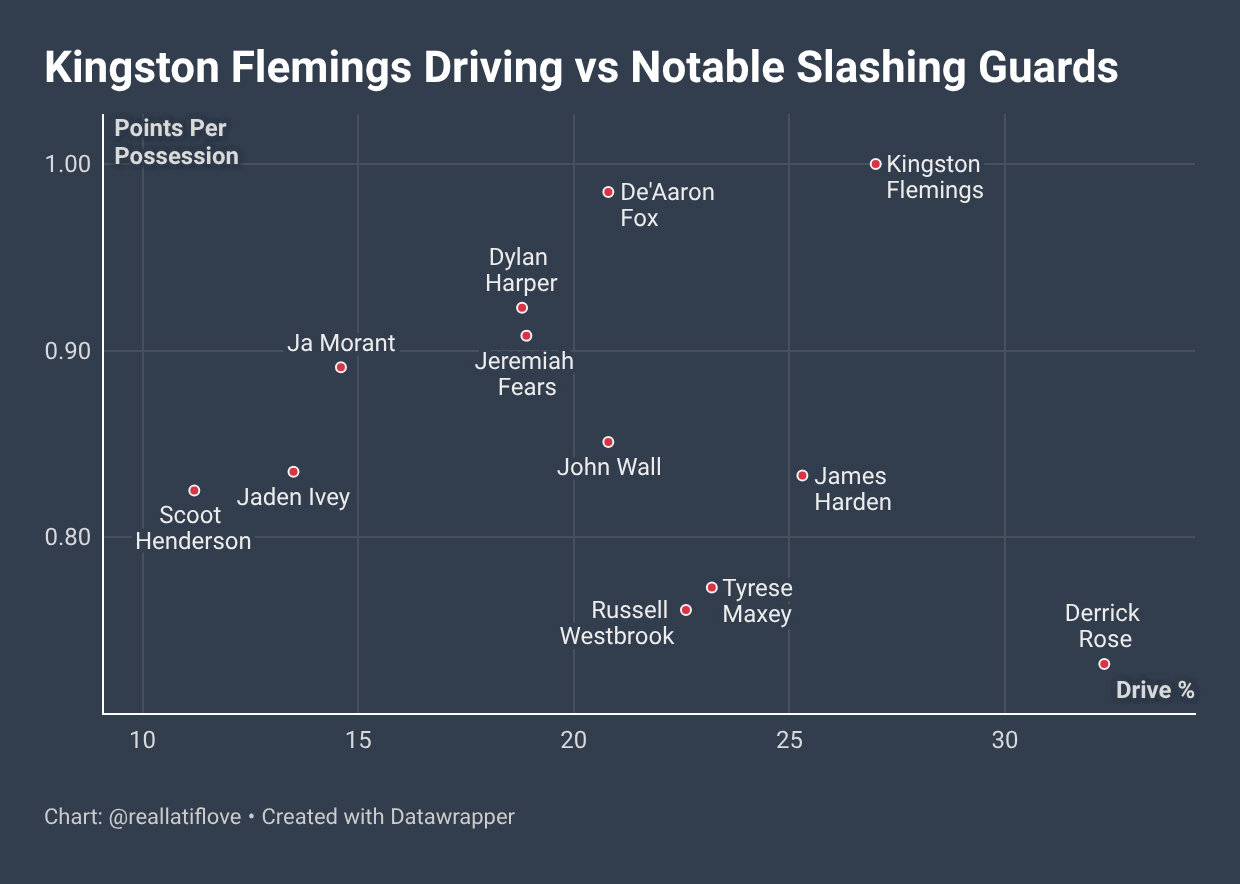 As you can probably tell, Flemings is an interior slanted guard that thrives at getting into the paint, but he does not draw fouls nearly as much as his profile would suggest he should. Flemings has a 28.9 FTR and a 25.0 FTR on drives, drawing a shooting foul on just 8.8 percent of his drives.