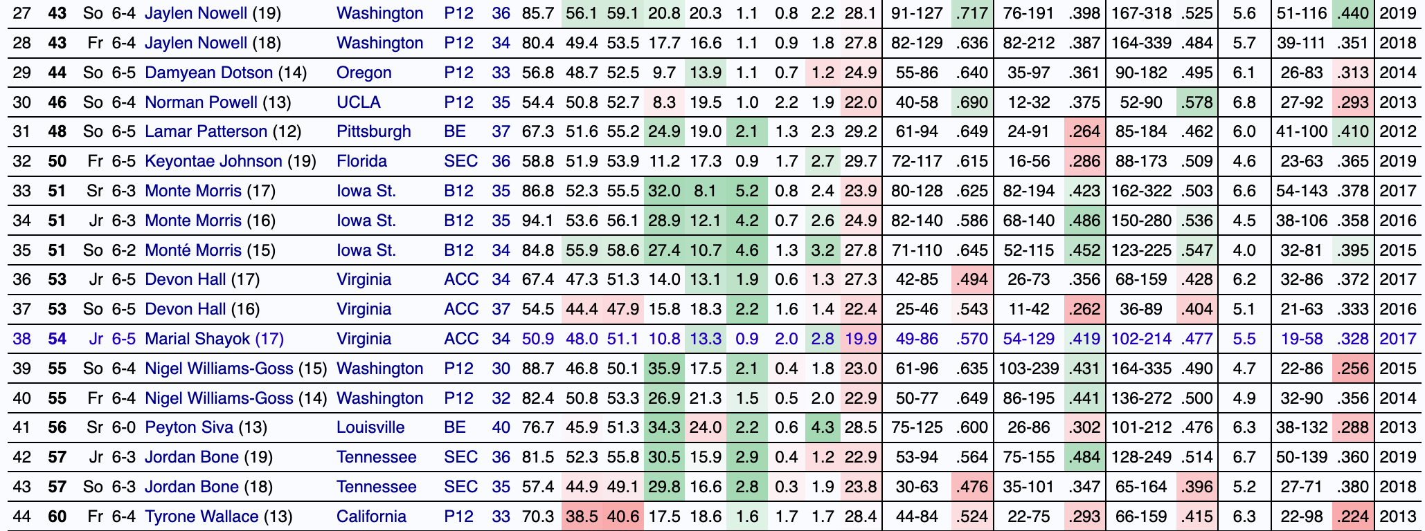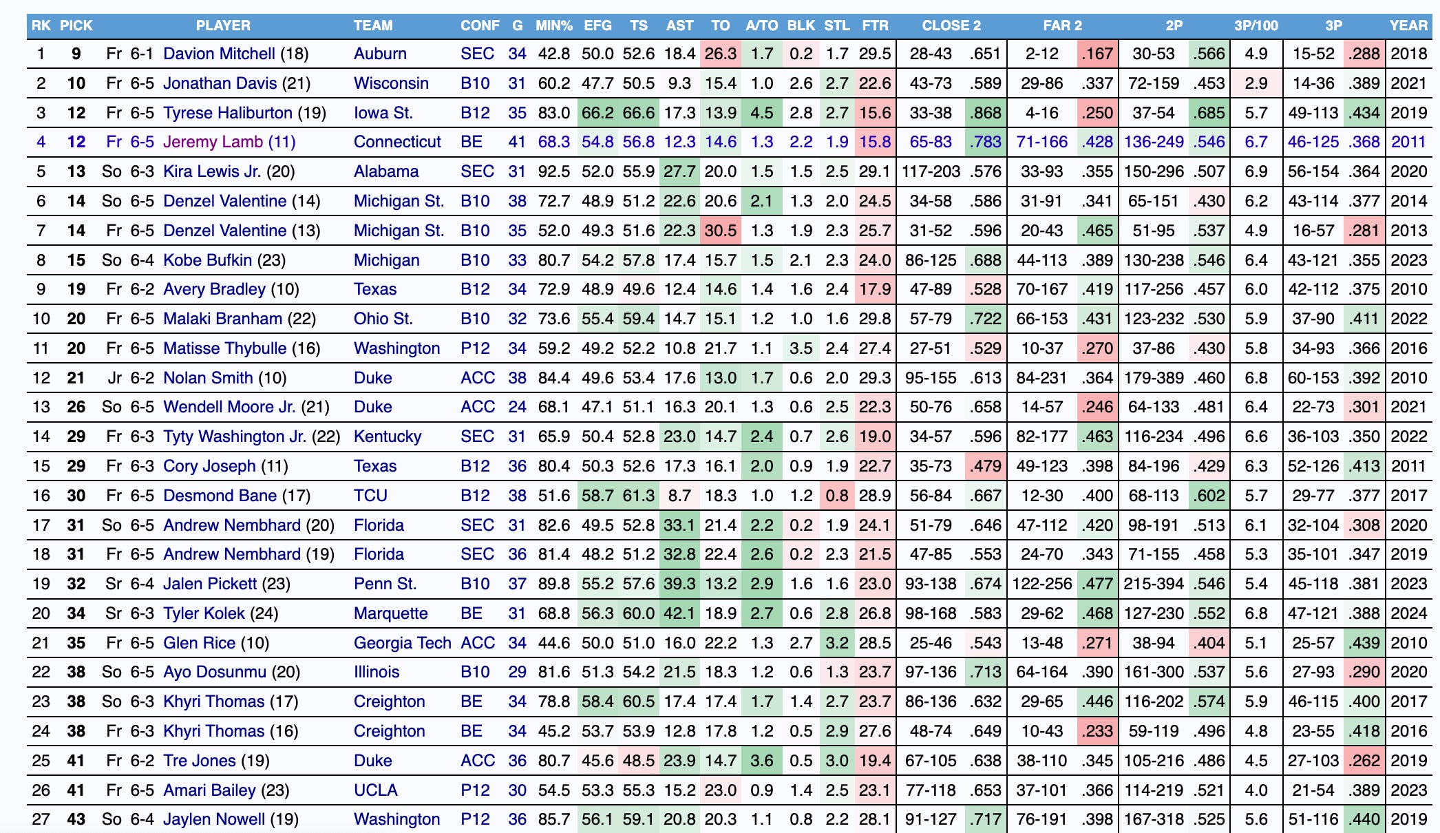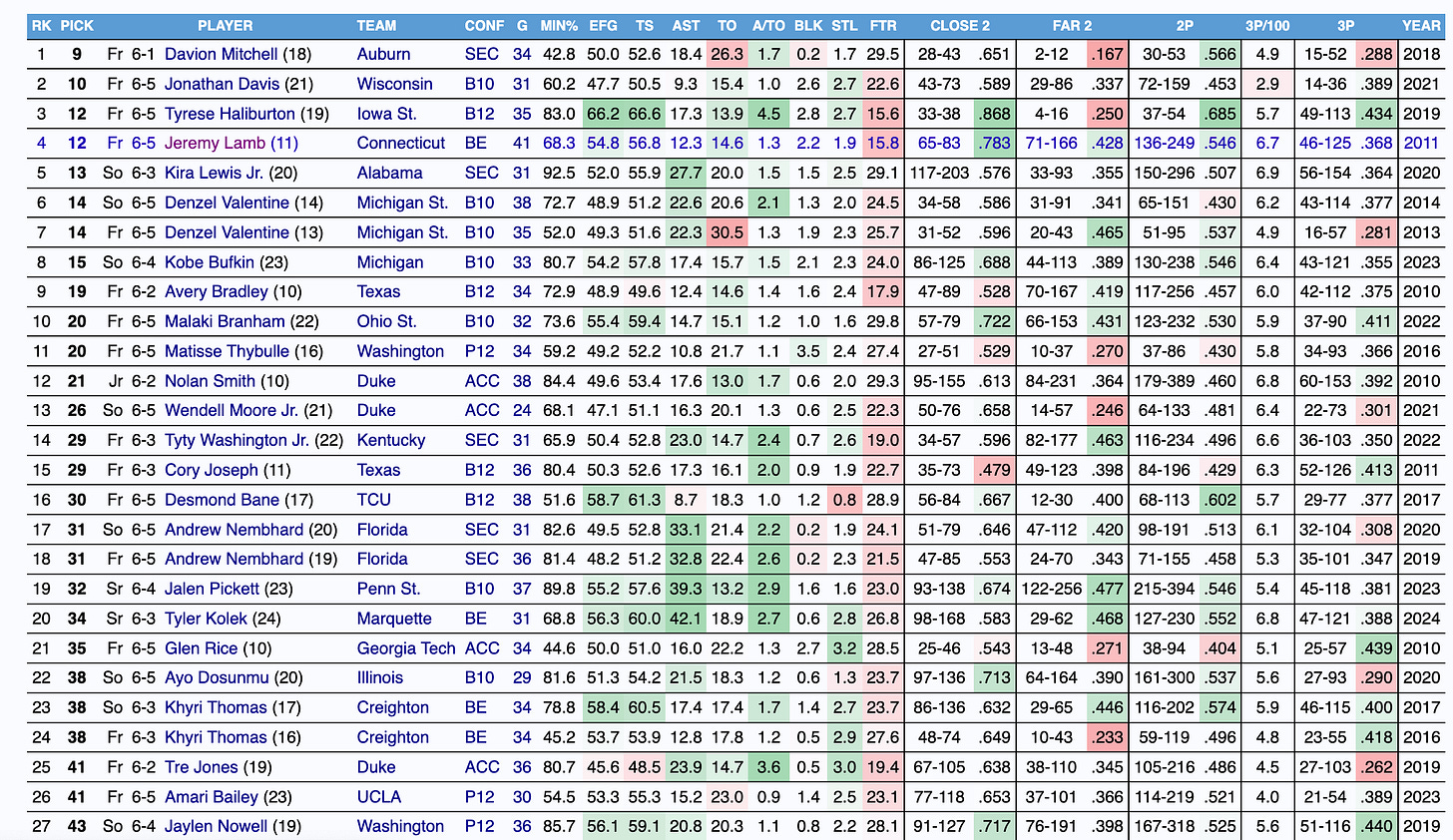 The list is filled with players who either couldn’t stick around in the league or have been underwhelming scorers. 16 of the 35 players listed met this criterion in their pre-draft seasons (and throughout their collegiate career for the players who spent multiple years in college), and nearly all of them who’ve played significant minutes in the NBA fall below the average true shooting percentage.