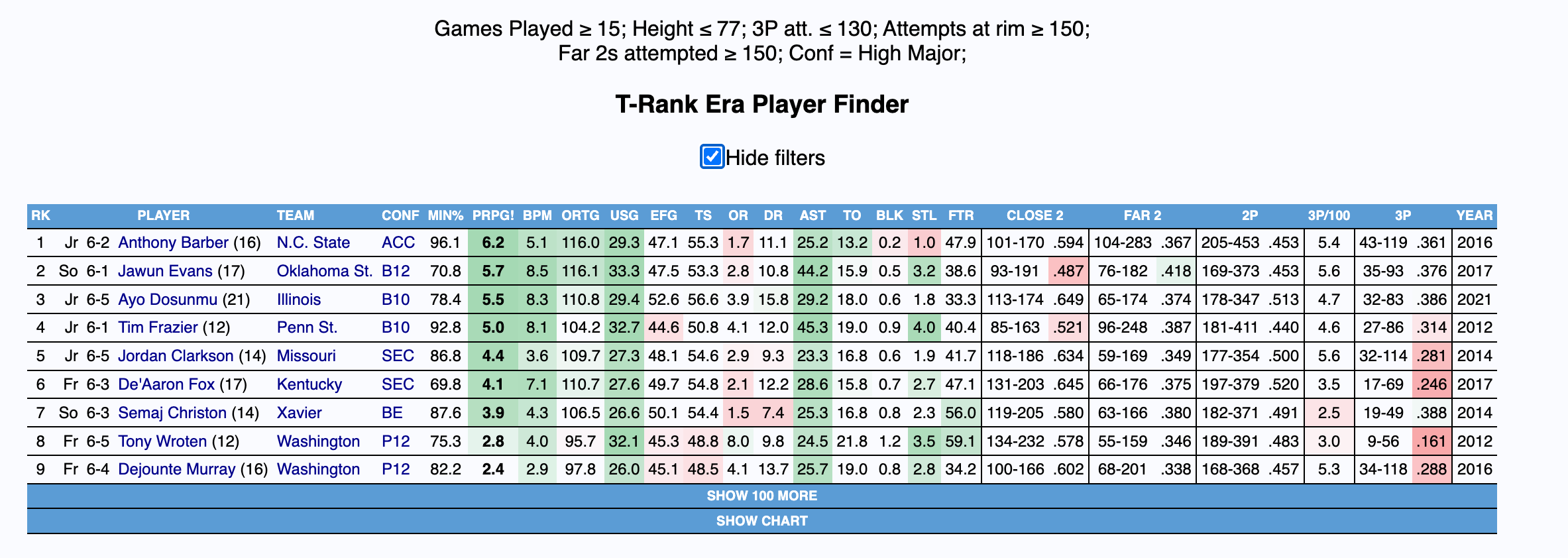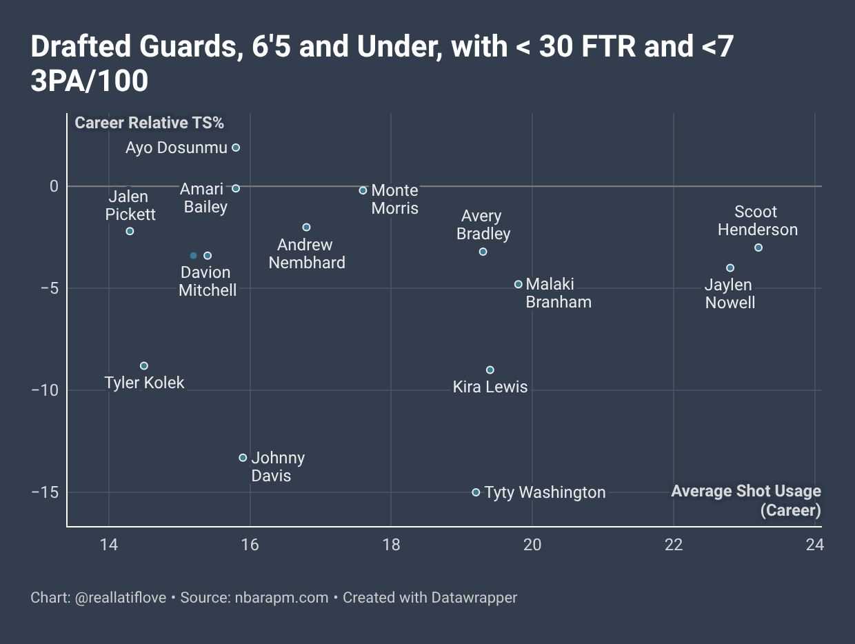 Below is a query of drafted guards 6’5 and under who find themselves within an intersection of fewer than seven three-point attempts per 100 possessions and below 30 FTR in their pre-draft seasons. Three-point attempts per 100 is used as a proxy because Bartorvik does not allow sorting by 3PAR, but many of these players fall within the <30 3PR / <30 FTR intersection.
