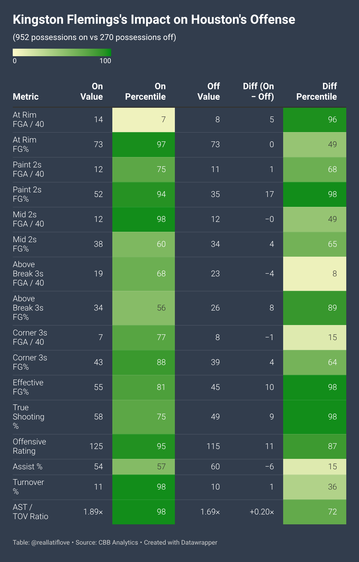 Below is a chart with data from CBB Analytics detailing Fleming’s impact on Houston’s offense.