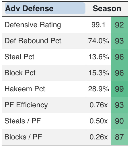 The Commodores rank in the 97th percentile in Hakeem percentage (steal% + block%) and maintain that level with him off the floor, but on film, his defensive awareness is evident.