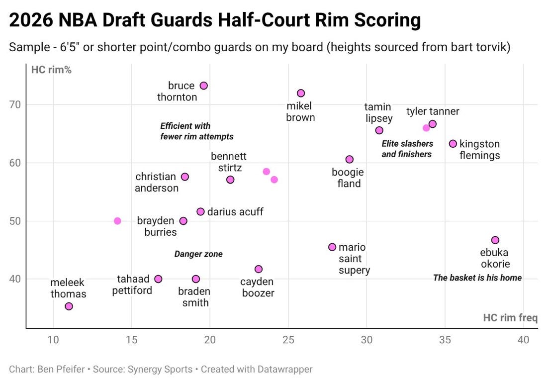 These marks place him among the class's best half-court drivers, with a high rim frequency and a rim field goal percentage.