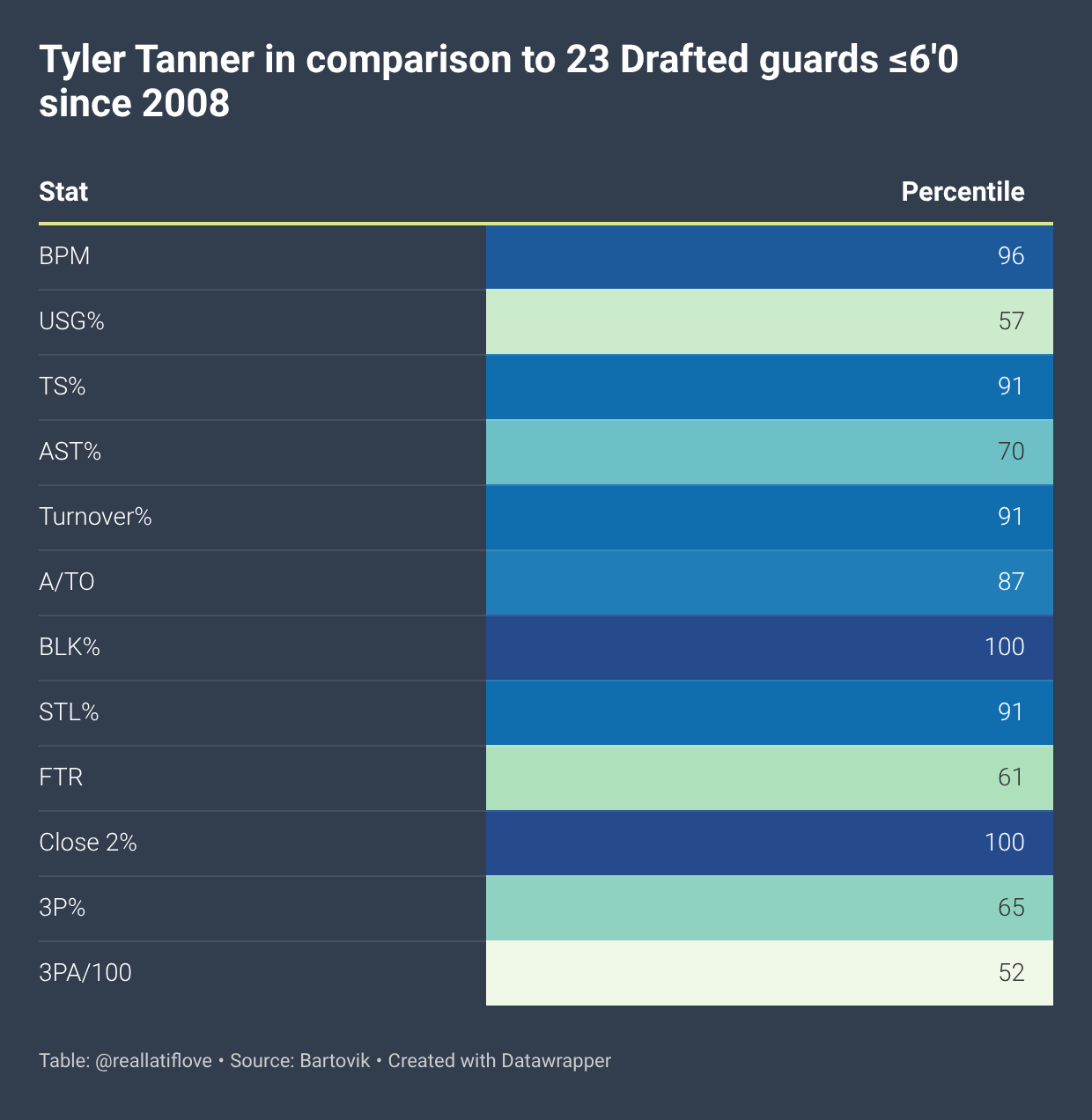 Ultimately, Tanner has the makings of a moderate-usage lead guard bet (a la Fred Vanvleet) who has a strong influence on a team winning the possession battle (arguably the most important key to winning a basketball game), who can be slotted next to another high-usage creator and toggle on and off the ball on offense.