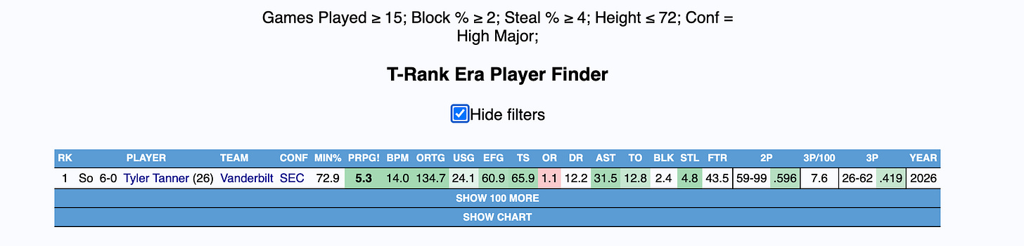 Tanner stands alone as the only high-major guard under 6’0 to post at least a two-block percent and a four-steal percent.