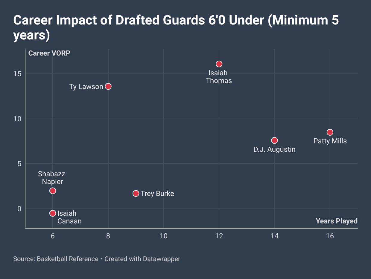 Of those 23, only seven players — Isaiah Thomas, Ty Lawson, Patty Mills, DJ Augustin, Trey Burke, Shabazz Napier, and Isaiah Cannaan played more than five seasons in the NBA.